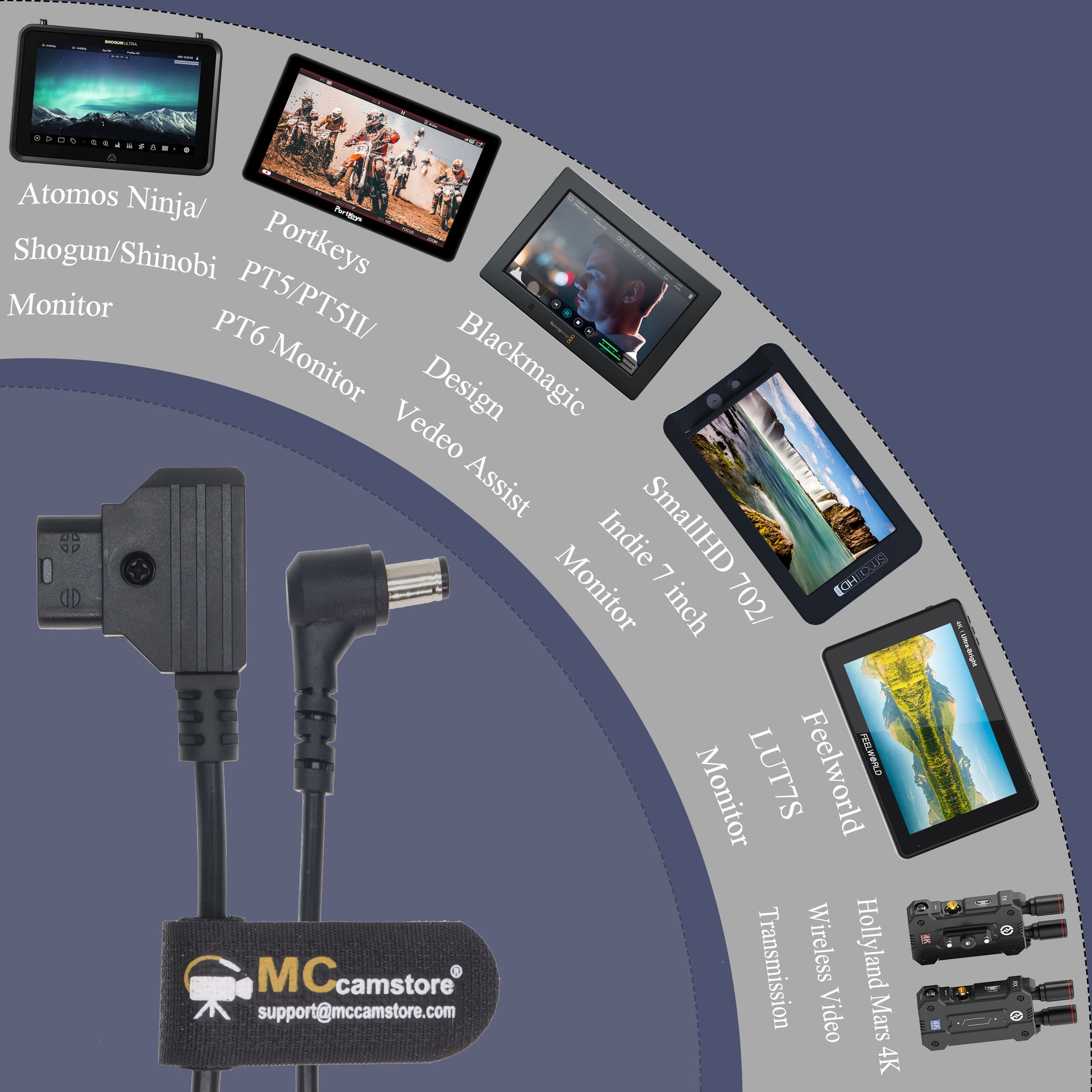 * Compatible device: for Blackmagic Design Video Assist, for Atomos Ninja/Shogun/Shinobi Monitor, for SmallHD 702/Indie 7 Monitor, for Hollyland Mars 4K Wireless transmission system, for Feelworld F6 Plus/LUT7S Monitor, Portkeys PT5/PT5 II/PT6/LH7P/LH7H Monitor, KiPRO LCD Monitors, Lectrosonic, Lowel Blender LED, 5" Ikan monitor, PowerTap-Lectro, LCD interface cable for AF100, GH1/GH2. For Panavision, Arriflex, Moviecam, Arricam, Betacam & all other cine/broadcast rigs LCD, LED, Monitor, Camera, Recorder, Receiver, Stabilizer and other devices